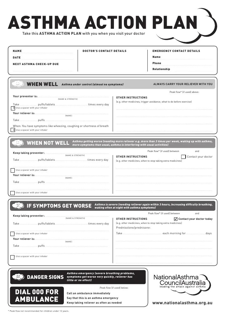 Everyone with asthma should have an asthma action plan in writing. Download a printable asthma action plan in english, spanish or hebrew and work.