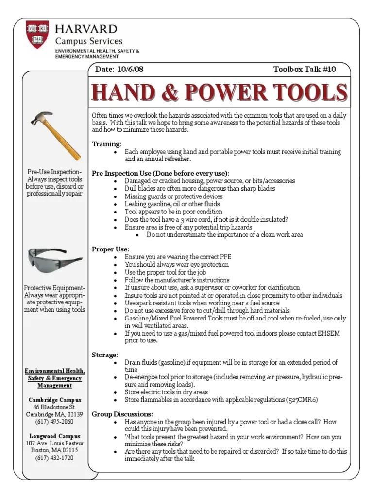 You can also use the search button in the upper right corner to look for specific topics of interest. Browse over 100 free toolbox talks on various health and safety topics for construction workers. Read online or download the pdfs to print and use at your next safety meeting. An explanation of the hazard. Download free pdfs for various osha.